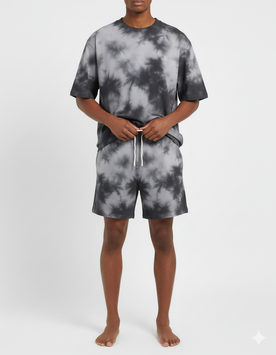 Embrace effortless cool with our Monochrome Mists Oversized Tee & Shorts Co-Ord Set. This statement duo features a striking black on white tie-dye that creates a smoky, dynamic pattern, blending ultimate comfort with a minimalist street aesthetic.